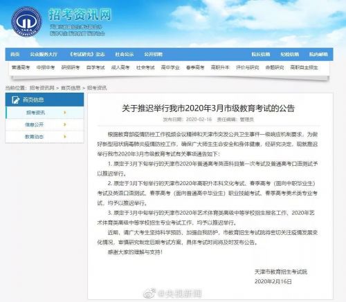 今天,天津市教育招生考试院发布通知,原定于3月下旬举行的天津市2020年普通高考英语科目第一次考试及普通高考口语测试予以推迟举行。另外,原定于3月中下旬举行的天津市2020年高职升本科文化考试、春季高考(面向中职毕业生)考试及英语口语测试、春季高考(面向普通高中毕业生)职业技能考试、春季高考美术类专业考试,艺术体育类高级中等学校招生报名工作、专业考试工作,均予以推迟举行。具体考试时间将及时发布公告。