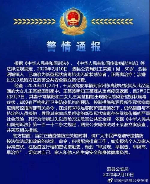 2月11日,公安机关以涉嫌妨害传染病防治罪对王某波取保候审,目前案件正在进一步办理中。
