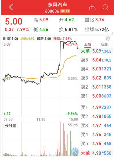 在消息公布后,无人驾驶板块盘中出现异动,收盘时拓普集团、北斗星通、兴民智通、伯特利、星宇股份、宁波高发等逆市上涨。东风集团旗下两家公司东风汽车、东风科技异动最为明显,上述两只个股均在午后14:04左右被迅速拉升至涨停板,最终尾盘分别收涨7.99%、2.55%。