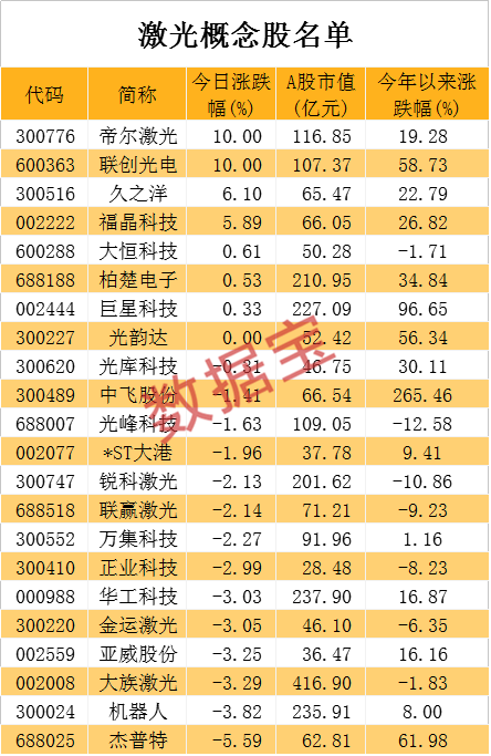 除了万集科技外,A股与激光业务有联系的上市公司有20家以上,如光韵达、大族激光、联赢激光、锐科激光、柏楚电子等。从盘面数据来看,激光概念股今日有2股涨停,分别是帝尔激光、联创光电,其中帝尔激光实现两连板,最新收盘价创历史新高。久之洋、福晶科技则大涨5%以上。