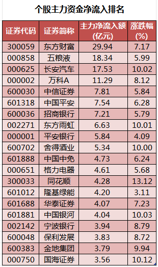 个股来看,今日有2375只个股获主力资金净流入,其中,90股获主力资金净流入超1亿元。东方财富获主力资金净流入最多,净流入金额为29.94亿元;主力资金净流入居前的个股还有五粮液、长安汽车、万科A、中信证券、中国平安,流入金额分别为18.34亿元、17.53亿元、11.29亿元、7.81亿元、7.54亿元。