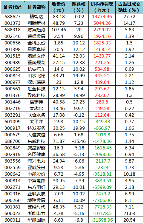 盘后龙虎榜数据显示,今日机构席位资金合计净卖出约5.68亿元。其中,净买入的个股16只,净卖出的个股16只。机构净买入最多的股票是精智达,净买入金额约1.48亿元;机构净买入的居前还有翔腾新材、财富趋势、荣盛发展等股。机构净卖出最多的股票是华能国际,净卖出金额约3.17亿元;机构净卖出居前的还有浙能电力、赛维时代、城建发展等股。