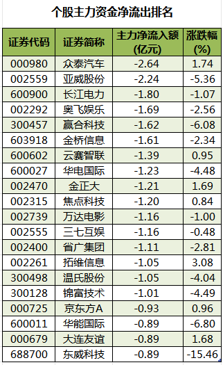 此外,2639只个股被主力资金净卖出,其中,16股被主力资金净卖出超1亿元。主力资金净流出最多的个股是众泰汽车,净流出金额为2.64亿元;主力资金净流出居前的个股还有亚威股份、长江电力、奥飞娱乐、赢合科技、金桥信息,净流出金额分别为2.24亿元、1.8亿元、1.69亿元、1.62亿元、1.61亿元。