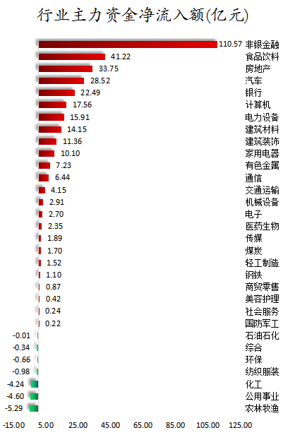 从行业板块来看,申万所属的31个一级行业,今日有24个行业板块主力资金呈现净流入,其中,非银金融行业板块主力资金净流入最多,净流入金额110.57亿元;行业板块主力资金净流入居前的还有食品饮料、房地产、汽车、银行、计算机,净流入金额分别为41.22亿元、33.75亿元、28.52亿元、22.49亿元、17.56亿元。7个行业板块主力资金呈现净流出,其中,农林牧渔行业板块主力资金净流出最多,净流出金额为5.29亿元;行业板块主力资金净流出靠前的还有公用事业、化工,净流出金额分别为4.6亿元、4.24亿元。