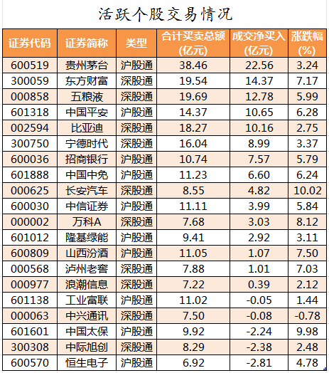 活跃个股方面,北向资金今日净买入较多的有贵州茅台、东方财富、五粮液、中国平安、比亚迪,净买入金额分别为22.56亿元、14.37亿元、12.78亿元、10.65亿元、10.16亿元。北向资金净卖出的有恒生电子、中际旭创、中国太保、中兴通讯、工业富联,净卖出金额分别为2.81亿元、2.38亿元、2.24亿元、0.08亿元、0.05亿元。