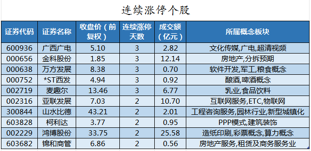 截至收盘,沪深两市合计4246只个股上涨,698只个股下跌,平盘个股73只,停牌的个股10只。不含当日上市新股,共有62只个股涨停,0只个股跌停。连续涨停天数看,万方发展、金科股份、麦趣尔、广西广电、*ST西发均已连收3个涨停板,连续涨停板数量最多。