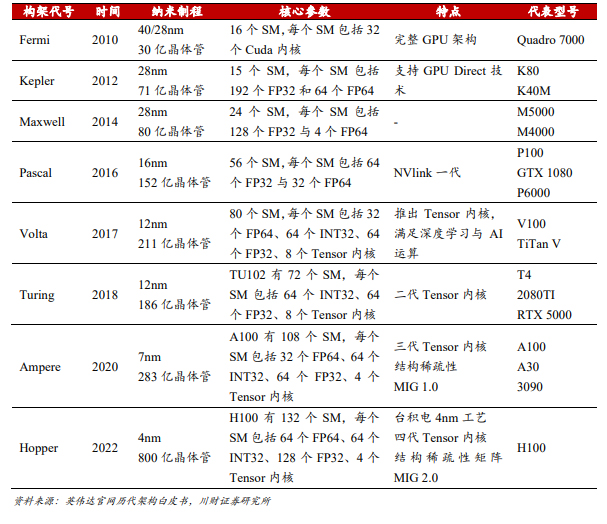 GPU架构迭代频繁,已从从专用图形处理器发展为高效的通用计算平台,向外拓展人工智能计算及高性能计算领域。当GPU引入可编程特性,将图形硬件的流水线作为流处理器来解释,基于GPU的通用计算也开始出现,即GPGPU。英伟达产品在2008-2022年内,架构迭代调整了8次,其在2010年推出具有完整GPU架构的Fermi,在2017年Volta架构中首次推出Tensor内核以支持深度学习算法,而目前Hopper架构的GPU已广泛的应用于AI大模型训练与推理环节。