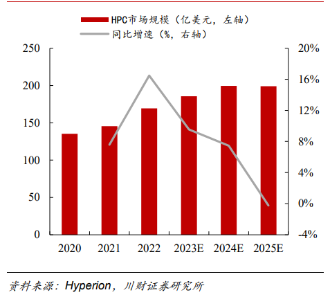 高性能计算中心及智算中心建设属于数字经济建设重要的一环,二者的建设将带动GPU市场增长。据Hyperion研究显示,2025年全球高性能计算市场规模将达到199亿美元,2022-2025 年CAGR约为5.5%,此外,根据超算top500统计,全球前500超级计算机中56%算力由GPU提供,GPU需求将随着高性能计算市场增长同步提升,预计2023年全球高性能计算中心GUP市场空间约为21亿美元。