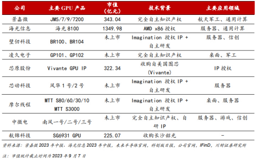 国内在GPU具有布局的公司基本处于产业链上游。重点公司中,景嘉微、凌久电子、中微电等少数企业拥有完全自主知识产权,从GPU IP核、计算架构、算法模型、原理验证、硬件实现、驱动开发等环节正向设计,从而保证GPU升级迭代自主可控;其他厂商则通过IP授权与自主研发相结合的方式开发产品,部分产品在性能上已与国际接轨。
