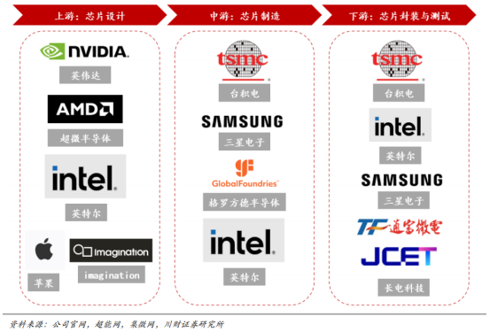 GPU 产业链上中下游分别为芯片设计、芯片制造及芯片封装与测试。产业链上游,GPU设计基本以英伟达、超微半导体、英特尔三强垄断,中下游台积电凭借先进的 4nm、7nm工艺及 CoWoS 封装技术产能领先,三星电子、格罗方德半导体、英特尔产能落后,且在产品工艺上与台积电相比优势不大,此外,在封装测试环节,国内厂商长电科技、通富微电及赛微电子等具有布局。2022年全球前十大封测企业中,长电科技以 10.7%的市场份额位居第三,通富微电以6.5%的市场份额位居第四。