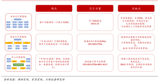 车载芯片的架构模式经历分布式架构向混合式架构转变,未来将向中心计算架构演进。计算架构将随着自动驾驶升级进行优化,不同的计算架构,对于车载芯片的要求具有差异。分布式架构计算需求小,仅通过CPU控制;混合式架构为实现部分自动驾驶功能将引入GPU来辅助计算;而中央计算架构中,汽车端计算将升级为更加通用的计算平台,进而保证了整车架构的稳定性和功能的扩展性。