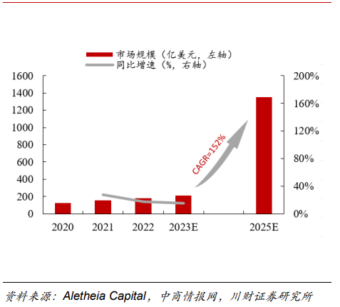 总量方面,根据IDC及中商情报网数据预测,2023年全球AI服务器市场规模将达到211亿美元,同比增长15%,而据 Aletheia Capital 最新报告分析,2025年AI服务器市场规模将激增至1350亿美元,2023-2025CAGR 高达152%;价值方面,由于智能算法具有计算难度小、计算量大等特点,对于计算任务的高并发能力及吞吐量要求较高,因此对于GPU的需求更大,据统计,机器学习型AI服务器中,GPU成本占比约为72.8%。未来,随着智算中心建设有序推进,GPU有望迎来量价齐升,预计2023年AI服务器领域 GUP市场空间约为187.8亿美元。