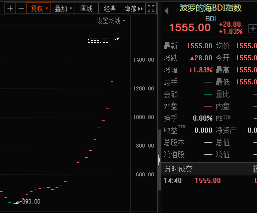 在周四暴涨了22.55%后,昨天波罗的海干散货指数(BDI)再度上涨,收于1555点,创下近半年新高。本周,BDI指数创纪录大涨近70%,最新点位相比于一个月前的最低点已累计上涨近300%。