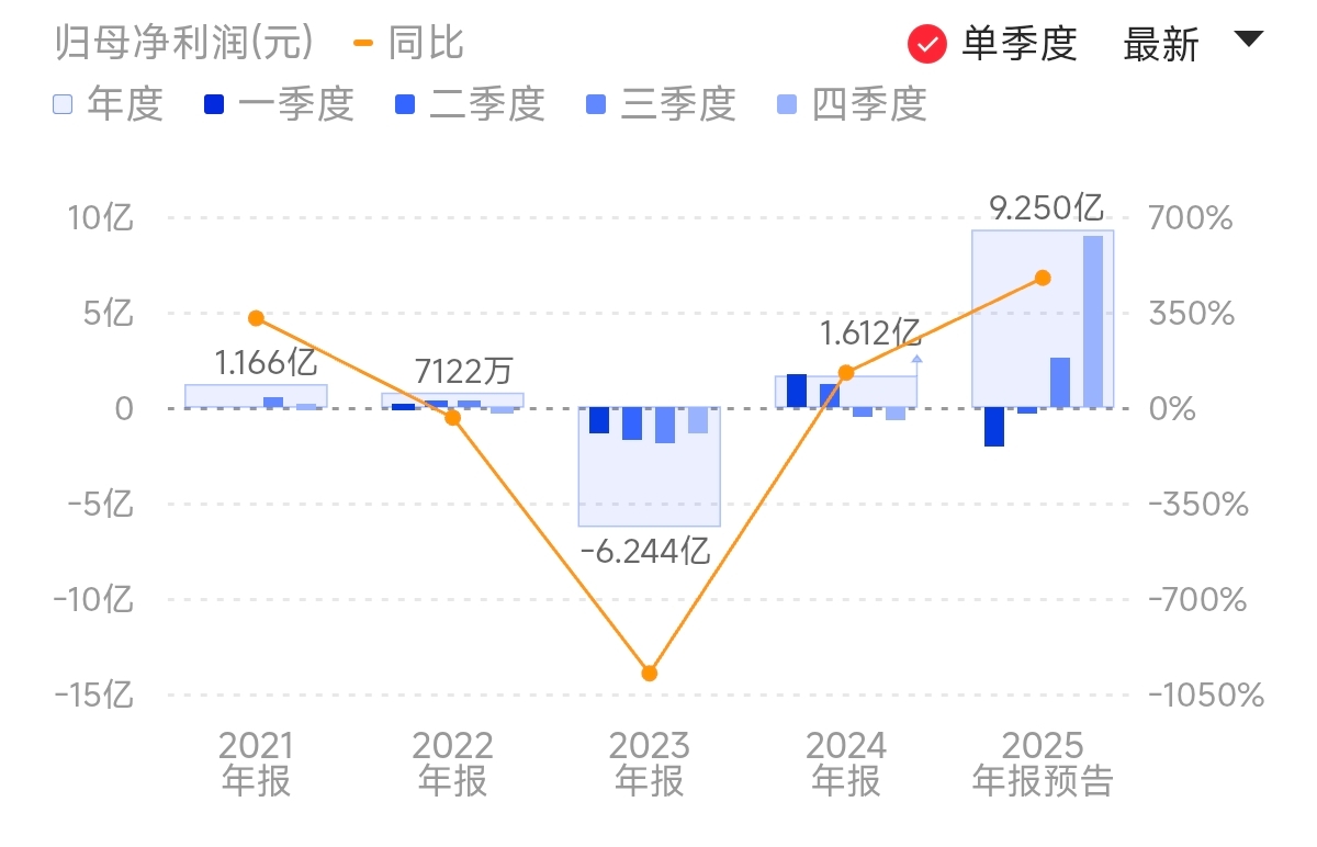 另外,该公司预计2025年净利润为8.5亿元-10亿元,同比增长427.19%-520.22%;2025年四季度净利润预计为8.2亿元-9.7亿元,同比增长1225.40%-1449.67%,环比增长219.89%-278.43%。该公司2025年度扣非净利润7.6亿元-9亿元,同比增加1034.71%-1243.74%。