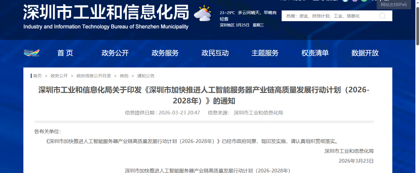 深圳市工业和信息化局近日印发《深圳市加快推进人工智能服务器产业链高质量发展行动计划(2026—2028年)》,提出到2028年,AI服务器全产业链产品产能与出货量实现跨越式增长,核心芯片、存储、印制电路板(PCB)、电源储能、光模块、被动元器件等重点领域产品全球市场份额显著提升。