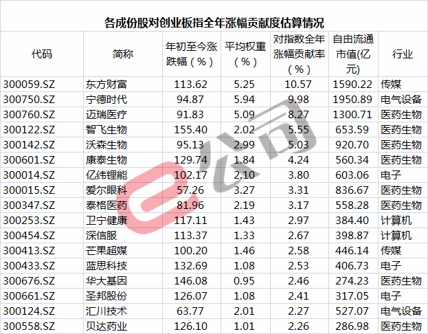 考虑到成份股权重的变化,以年初与最新权重的算术平均值作为权重值,e公司记者发现前21只个股就贡献了创业板指全年80%的涨幅,其中东方财富、宁德时代、迈瑞医疗、智飞生物、沃森生物等8只股票对创业板指全年涨幅贡献率累计达50%。