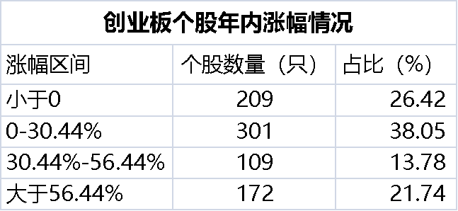 据统计,创业板块共有800多只,剔除今年上市的新股,板块个股平均涨幅达30.4%。分区间来看,近四成个股涨幅还未达到平均水平,近八成个股跑输创业板指。