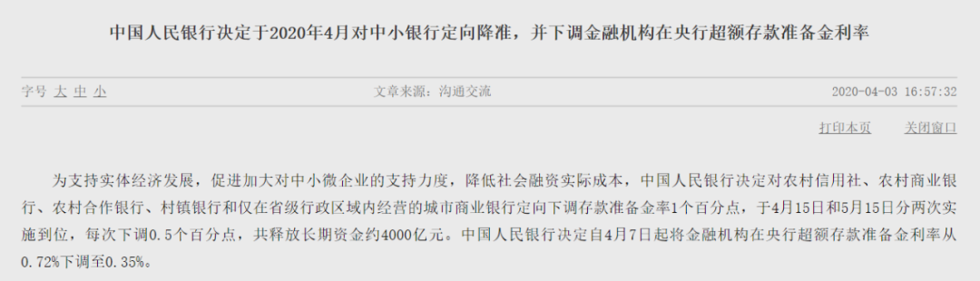 央行网站显示,最近一次定向降准(4月15日和5月15日分两次实施),共释放资金约4000亿元。