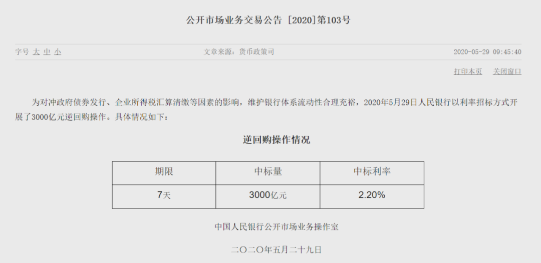 央行早间公告,2020年5月29日人民银行以利率招标方式开展了3000亿元逆回购操作。具体看,期限均为7天,中标利率2.2%,与前次操作相同。