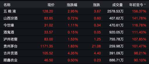 今年以来白酒股股价爆发,白酒指数年初至今涨幅达71.73%,其中17只成分股年内无一下跌,五粮液(000858)涨幅居首,高达156.37%。“白酒之王”贵州茅台(600519)年内涨幅101.47%。