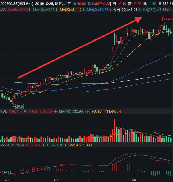 在今年年初的那波上涨行情中,顺鑫农业股价从29.5元低点一路走高,最高涨至63.48元,涨幅达到115%。目前,顺鑫农业最新价为46.5元。