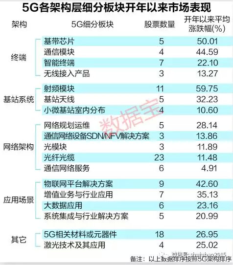 行业来看,涉及光纤光缆、5G相关材料或元器件及射频模块的公司数量较多,均超过10家,而无线接入产品、通信网络设备SDN/NFV解决方案及光模块相关公司数量较少。市场表现来看,128家5G概念股年内平均上涨近27%,大幅跑赢大盘。12个细分板块跑赢大盘,其中,射频模块、基带芯片模块平均涨幅超过50%,通信模块及物联网平台解决方案平均涨幅超过40%。