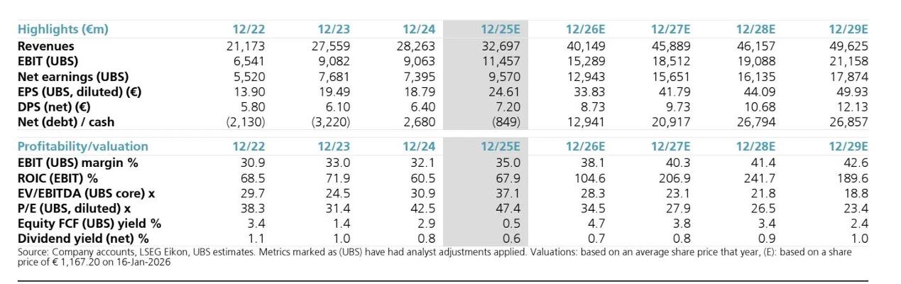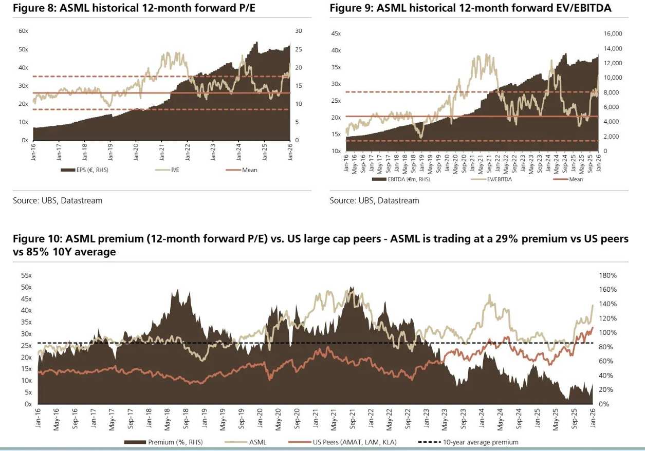 即使在经历股价大幅上涨之后,瑞银仍维持对于阿斯麦股票的“买入(Buy)”评级,并将12个月目标价上调至1400欧元(此前为1030欧元),最乐观牛市目标价更是高达1650欧元,且对于2026/27年营收与盈利预测显著上修。此外,瑞银认为阿斯麦2025年第四季度业绩(1月28日披露)以及未来光刻机订单/业绩指引大概率将超过市场预期,瑞银押注Q4光刻机订单在其模型判断下可能高至90亿欧元,远远高于上季度的54亿欧元,意味着中期的牛市动能足以支撑阿斯麦估值扩张空间。