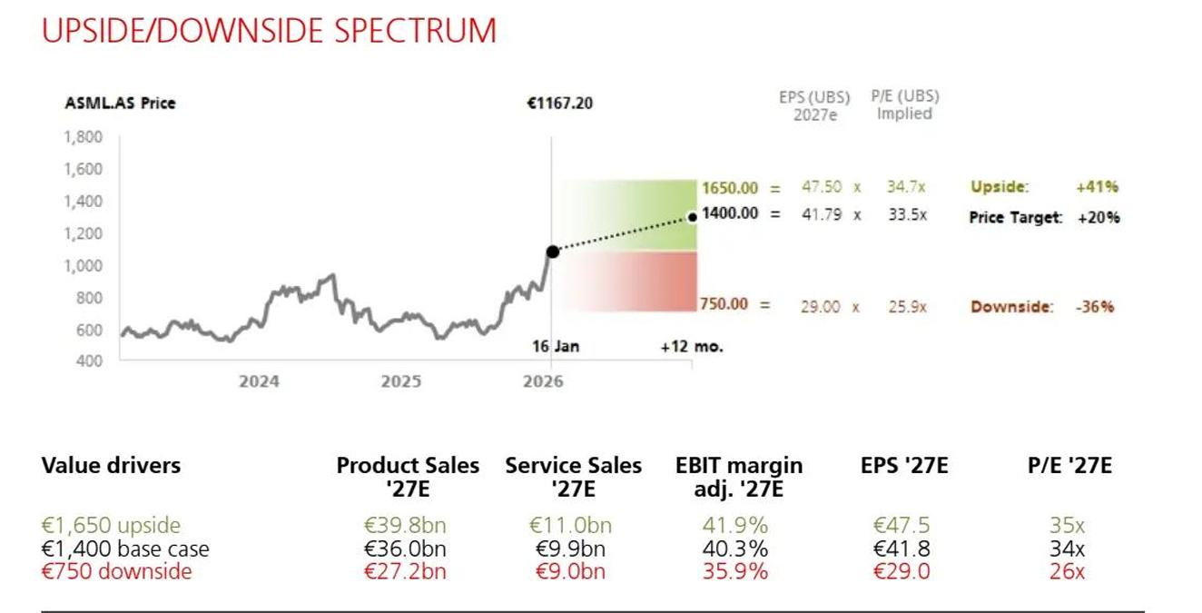 瑞银将阿斯麦的2026年营收增长预期从此前的增长14%大幅上调至23%,2027年增长预期则从9%上调至14%。瑞银预计阿斯麦即将披露的2025年第四季度总营收约为97.47亿欧元(符合公司指引的95亿欧元中值区间),预计2026年总体营收强劲增长23%至401.49亿欧元,预计2027年增长14%至458.89亿欧元。阿斯麦EPS(每股收益)预期方面,瑞银预计2026年该利润指标有望高达33.83欧元(较市场一致预期高出足足26%),2027年达41.79欧元(较市场一致预期高出25%)。在最乐观的EPS预期之下(即2027年EPS 47.5欧元),瑞银预计阿斯麦股价有望达到1650欧元。