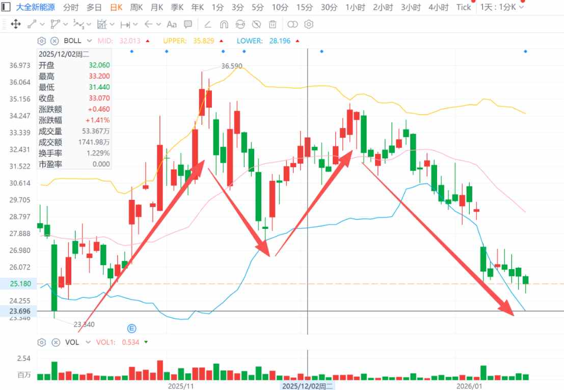 1月8日起,大全新能源的BOLL线出现向下大幅开口,并连续两个交易日在BOLL线下轨下方运行,超跌信号明显。