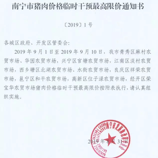 9月1日,广西南宁市发改委出手,为稳定猪肉市场价格,保障群众日常生活,经市政府同意,市发改委正式印发《南宁市发展和改革委员会关于实施猪肉价格临时干预的通知》,从9月1日起实施猪肉价格临时干预措施,在主要农贸市场设点限量限价销售猪肉。
