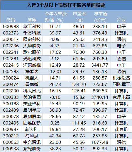 再如美的集团入选机器人50、深创100、物联网50三大指数样本股;思创医惠与新大陆则入选AI 50、大数据50、物联网50三大指数样本股;科大讯飞、美亚柏科、启明星辰与紫光股份均出现在深创100、AI 50、大数据50三大指数样本股名单中等。
