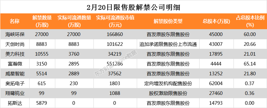 2月20日,两市共有8家公司限售股解禁,具体解禁公司包括海峡环保、天创时尚等。其中海峡环保实际解禁可流通股数量为27000万股,占其总股本比例为60.00%。