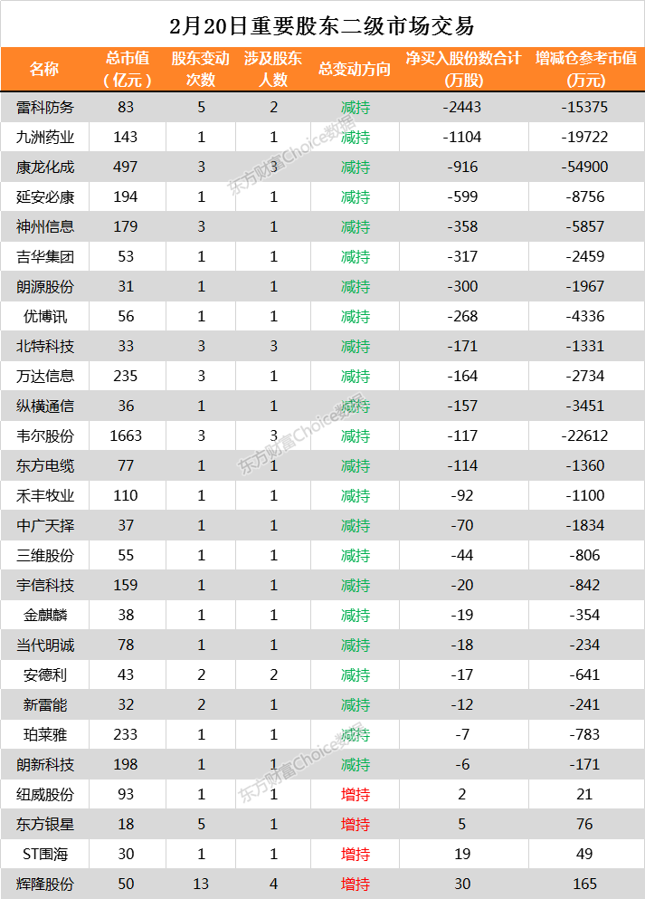 2月20日,两市共有27家公司公告进行重要股东二级市场交易。其中雷科防务净减持2443万股,减仓参考市值为15357万元。