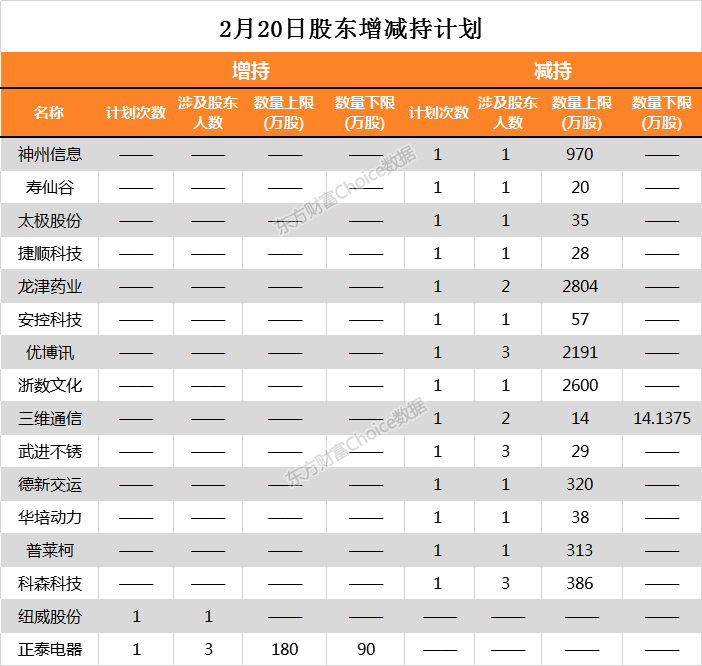 2月20日,两市共有14家公司公告股东减持计划,包括神州信息、龙津药业、浙数文化等。