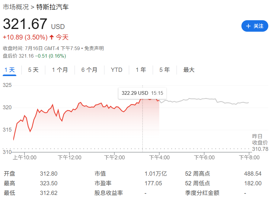 截至周三收盘时,特斯拉股价上涨3.5%,至321.67美元,重回200日移动均线。