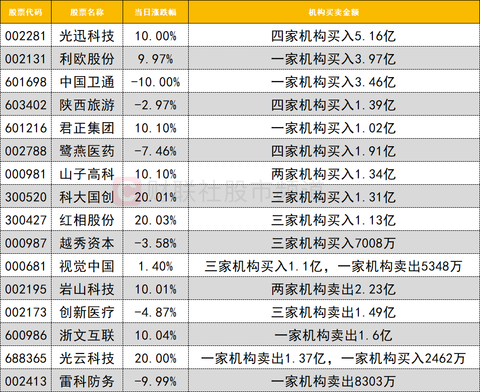 今日龙虎榜机构活跃度较高,买入方面,光迅科技涨停创新高,获四家机构买入5.16亿,同时深股通买入3.19亿。