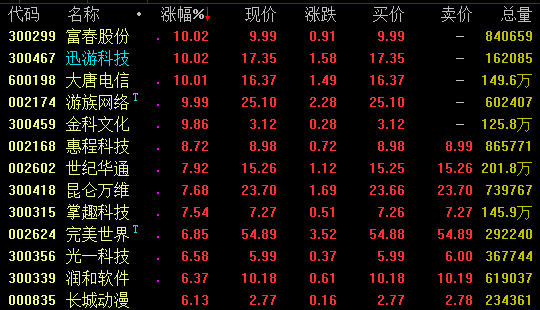 网游概念今日盘中走势活跃,截至收盘,富春股份、迅游科技、大唐电信、游族网络、金科文化等涨停,惠城科技涨近9%。