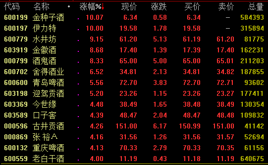 酒类股今日盘中大幅走高,截至收盘,金种子酒、伊力特涨停,水井坊涨逾9%,金微酒、酒鬼酒涨幅超8%,舍得酒业涨6.5%。