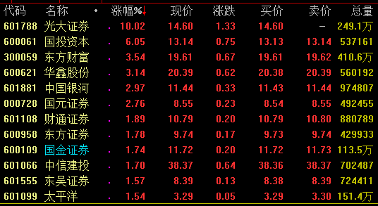 券商板块今日盘中震荡拉升,截至收盘,光大证券涨停,国投资本涨逾6%,东方财富、华鑫股份涨幅超3%。