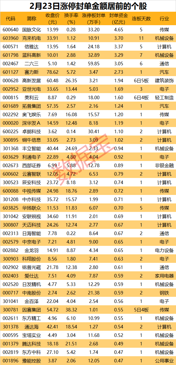 以封单金额计算,14股封单金额超亿元,国脉文化、克来机电、信雅达封单金额居前,分别为4.65亿元、3.7亿元、3.37亿元。