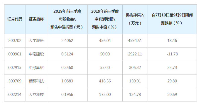 自7月10日至9月9日期间的龙虎榜当中,243只个股出现了机构的身影,其中97只股票呈现机构净买入状态,机构净卖出个股有146只。机构净买入超过亿元的个股达11只,净买入前三名分别是生益科技、中国软件、领益智造,机构资金流入净额分别是6.07亿元、3.07亿元、2.80亿元。在139只2019年前三季度大幅增长(增幅在五成及以上)的个股中,自7月10日至9月9日期间机构净买入的共有5只,其中净买入金额最大的个股有:天宇股份前三季度净利润增长456.04%,机构净买入4594.51万元;中南建设净利润增长50.00%,龙虎榜机构资金净流入2922.11万元;中欣氟材业绩同比增长55.00%,机构净买入306.32万元。另外,机构青睐的绩优个股自7月10日至9月9日期间市场表现不俗,中欣氟材涨幅达33.73%,跑赢大盘30.83%,精研科技上涨29.80%,超过大盘26.91%。