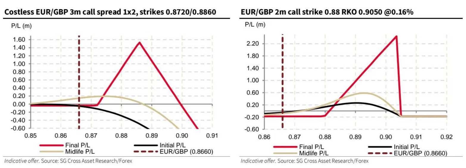 具体策略包括:买入EUR/GBP 3个月看涨价差1x2(行权价0.8720/0.8860,零成本),顶部盈亏平衡点0.90;买入EUR/GBP 2个月看涨期权(行权价0.88,敲出价0.9050,指示性报价0.16%);买入EUR/GBP 3个月数字看涨期权(行权价0.90,指示性报价12.5%)。