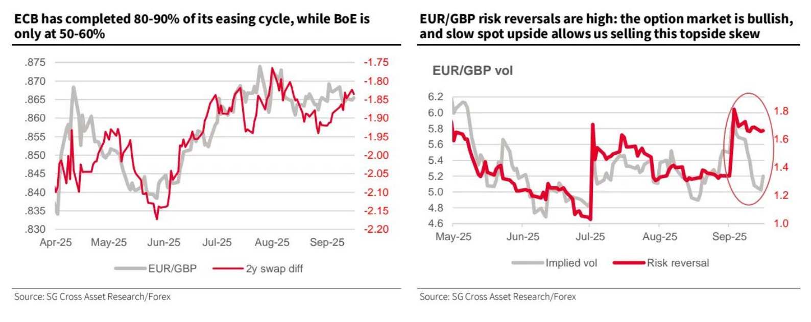 在交易策略层面,法国兴业提出利用期权市场的结构性机会。由于EUR/GBP看涨偏斜维持高位,期权市场通过顶部溢价维持看涨预期,可实施低成本策略获取正Theta收益,保护按市价计价的头寸。