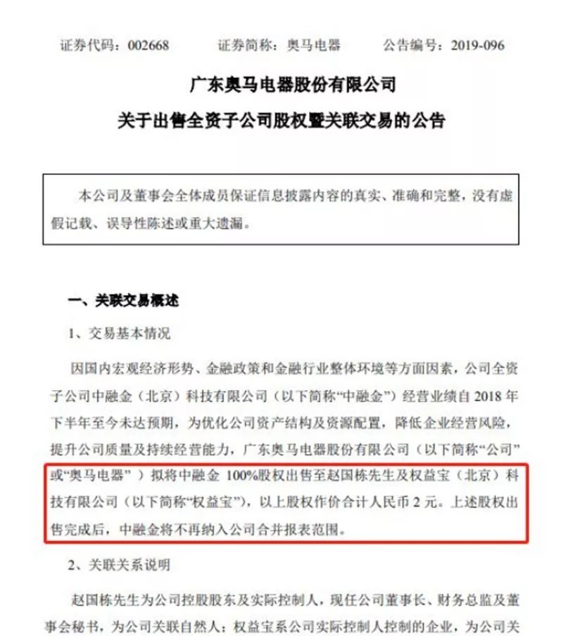 12月15日晚,奥马电器发布公告称,拟将中融金100%股权出售至赵国栋及权益宝(北京)科技有限公司,作价合计2元。