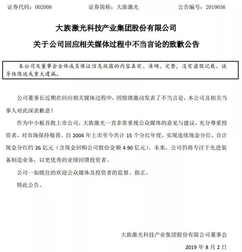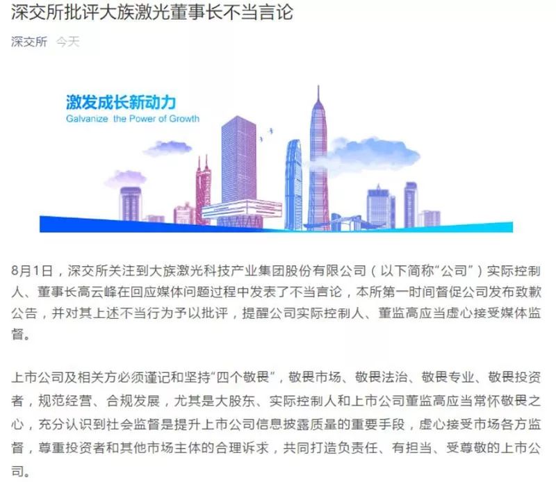 祸从口出。当日晚间,深交所发布消息称,已关注到大族激光实际控制人、董事长高云峰在回应媒体问题过程中发表了不当言论,深交所第一时间督促大族激光发布致歉公告,并对其上述不当行为予以批评,提醒公司实际控制人、董监高应当虚心接受媒体监督。