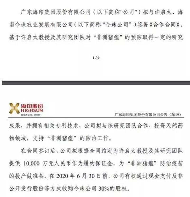 公告内容是,一位名叫许启太的教授(实则是一位曾被处以警告处分的“槟榔专家”)及其团队研发的注射剂“今珠多糖注射液”已经“研制成功”并“准备投产”,可以实现对非洲猪瘟不低于92%的有效预防率。海印股份拟斥资9亿元收购今珠公司30%的股权,并先给出1亿元作为履约保证金,为“非洲猪瘟”防治疫苗的投产做准备。