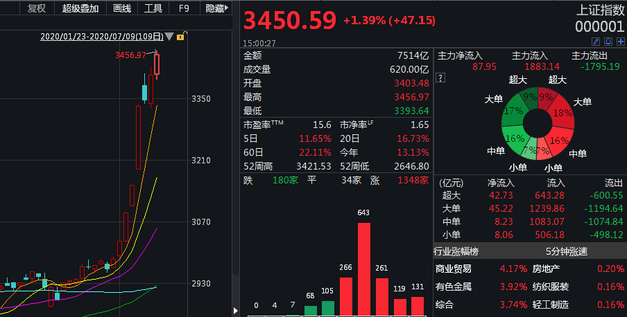 本周以来,来自各大行情交易软件弹屏的沪深两市成交金额不断刷屏手机。截至7月9日收盘,两市成交额达1.72万亿,至此沪深两市成交额连续四个交易日突破1.5万亿大关。