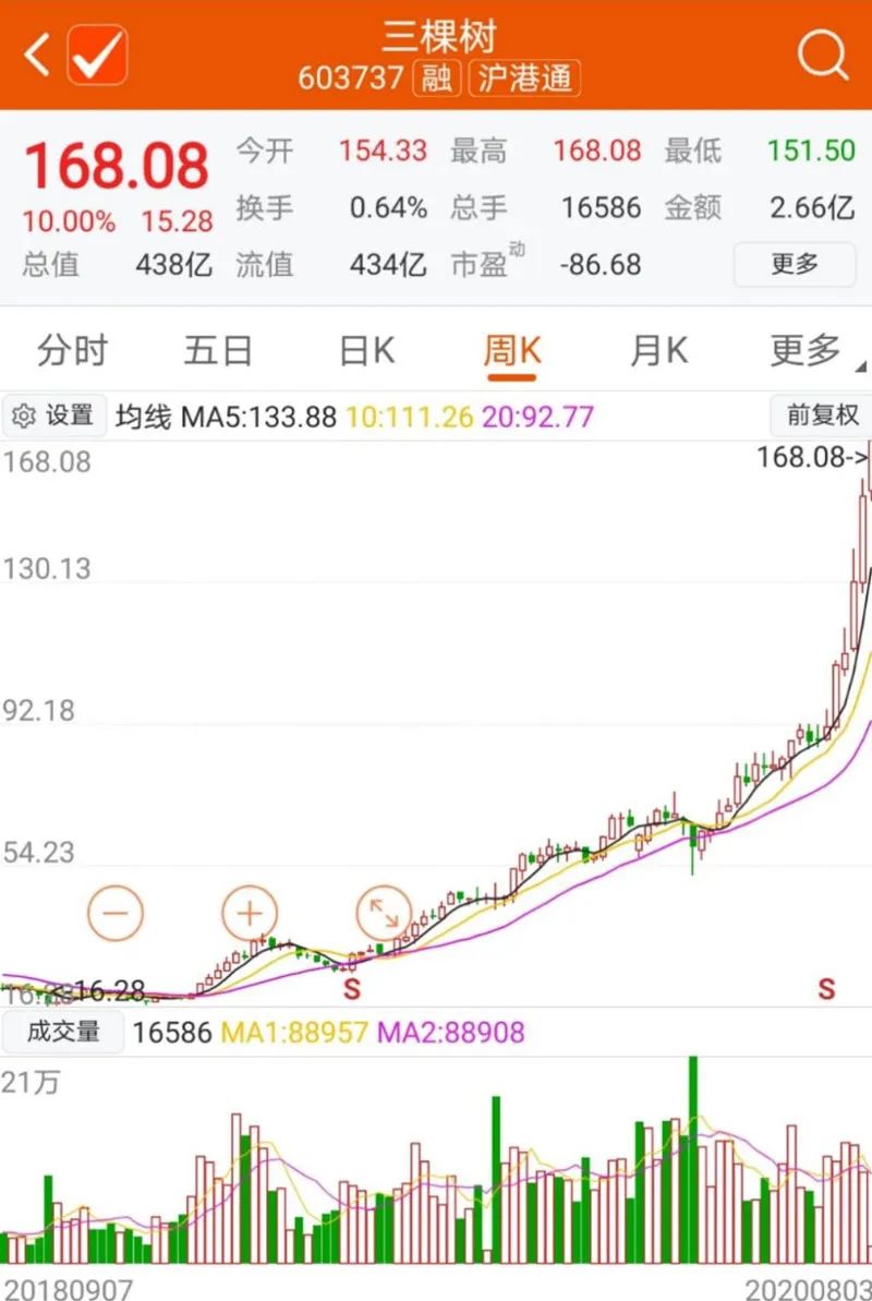 2018年10月份最低16.75元(前复权价),今年8月3日,涂料行业龙头股三棵树再度涨停,股价报收168.08元,是之前的十倍。