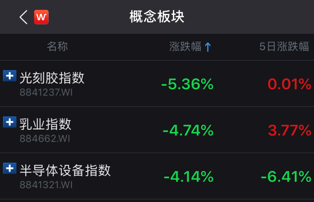 概念板块方面,光刻胶、乳业、半导体设备板块跌幅居前。