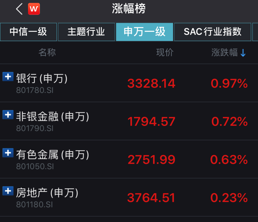 板块表现方面,申万一级行业板块午间收盘时涨跌互现。其中,大金融板块表现亮眼,银行、非银金融、有色金属、房地产板块涨幅居前。